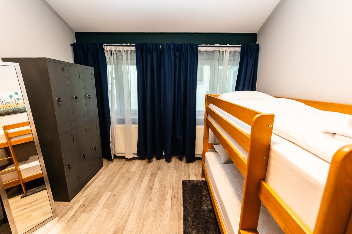 Chambre privée pouvant accueillir 6 personnes avec une salle de bains privative et une douche. Ces lits superposés disposent tous d'une lampe et d'une borne de recharge. Des équipements partagés, y compris la cuisine, le salon et le bar, sont à la disposition de tous les voyageurs.