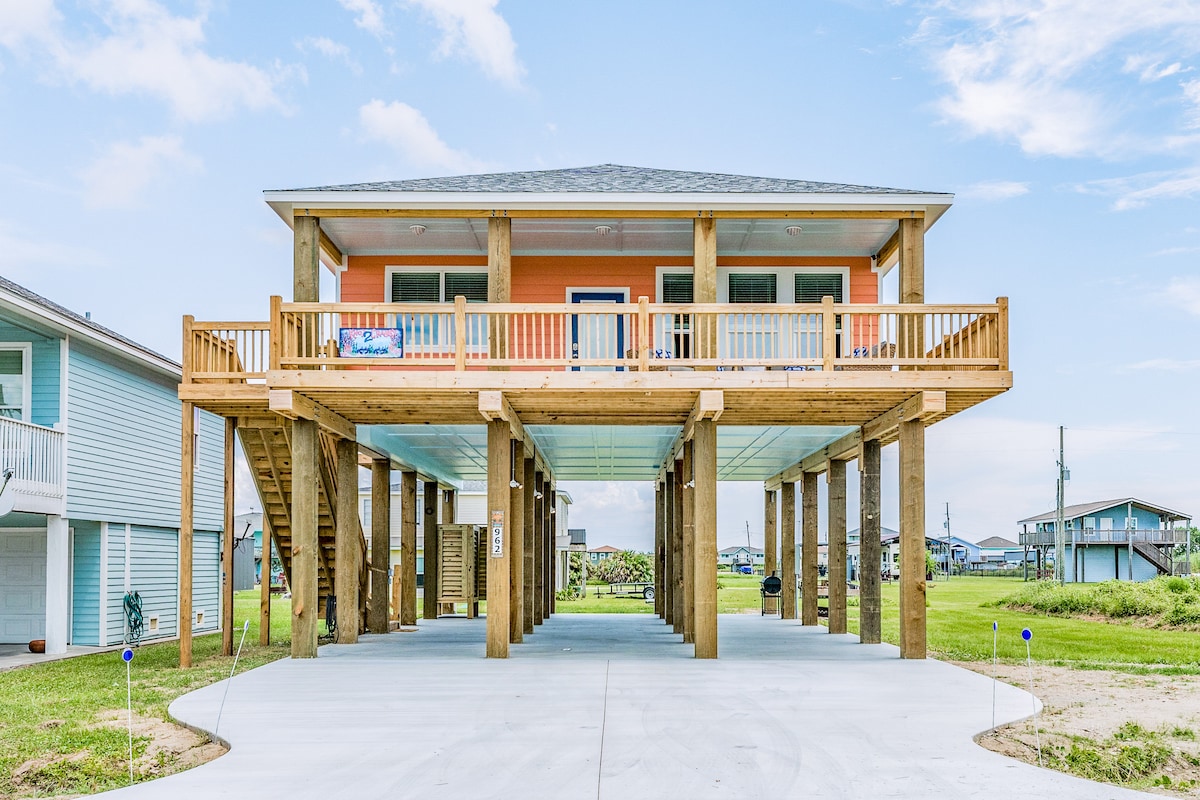 Venez dans cette incroyable maison de plage à Crystal Beach avec vue sur l'eau et à distance de marche de la plage. À l'extérieur, la propriété est entièrement dédiée à la détente et au divertissement, avec un foyer, des hamacs, des porches ombragés, des balcons panoramiques, un barbecue Weber et une table de ping-pong. À l'intérieur, vous trouverez 4 superbes chambres avec un coin nuit adapté aux enfants, un salon spacieux avec cheminée et une cuisine bien équipée, parfaite pour les familles, les amis ou les couples. 5 min à pied de la plage.