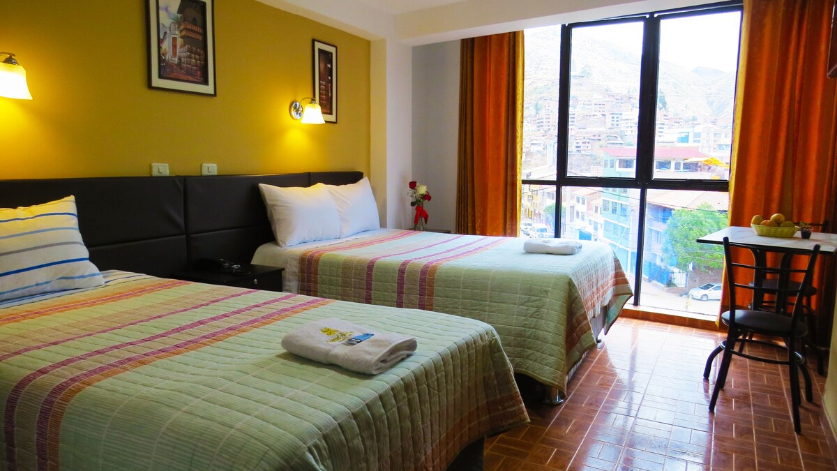 Nous sommes situés au cœur de cette belle ville, à proximité des restaurants, des cafés, des boutiques, des spas, notre hôtel est le point idéal pour explorer Cusco Chambres privées et confortables Chaque chambre comprend : • Salle de bain privée • Serviettes et produits d'hygiène personnelle • Eau chaude 24 h/24 et 7 j/7 • Wi-Fi gratuit • Ménage quotidien • Réception ouverte 24 h/24