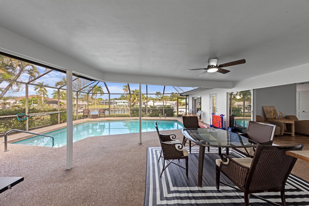 L'UN DES MEILLEURS RIVAGES DE CAPE CORAL ! À deux pas de la plage. Cette maison de plus de 2 500 pieds carrés offre de superbes couchers de soleil et une vue sur l'eau du sud-ouest depuis tous les principaux espaces de vie, ainsi que la suite parentale. Piscine chauffée avec éclairage LED coloré, spa intégré, bain de piscine, buanderie complète, lanai, cheminée, Wi-Fi et téléviseurs dans chaque chambre, quai privé. Bateau sur ascenseur à louer avec RPM rentals. Grand garage pour 2 voitures avec 5 vélos, chariot de plage et glacière sur place.
