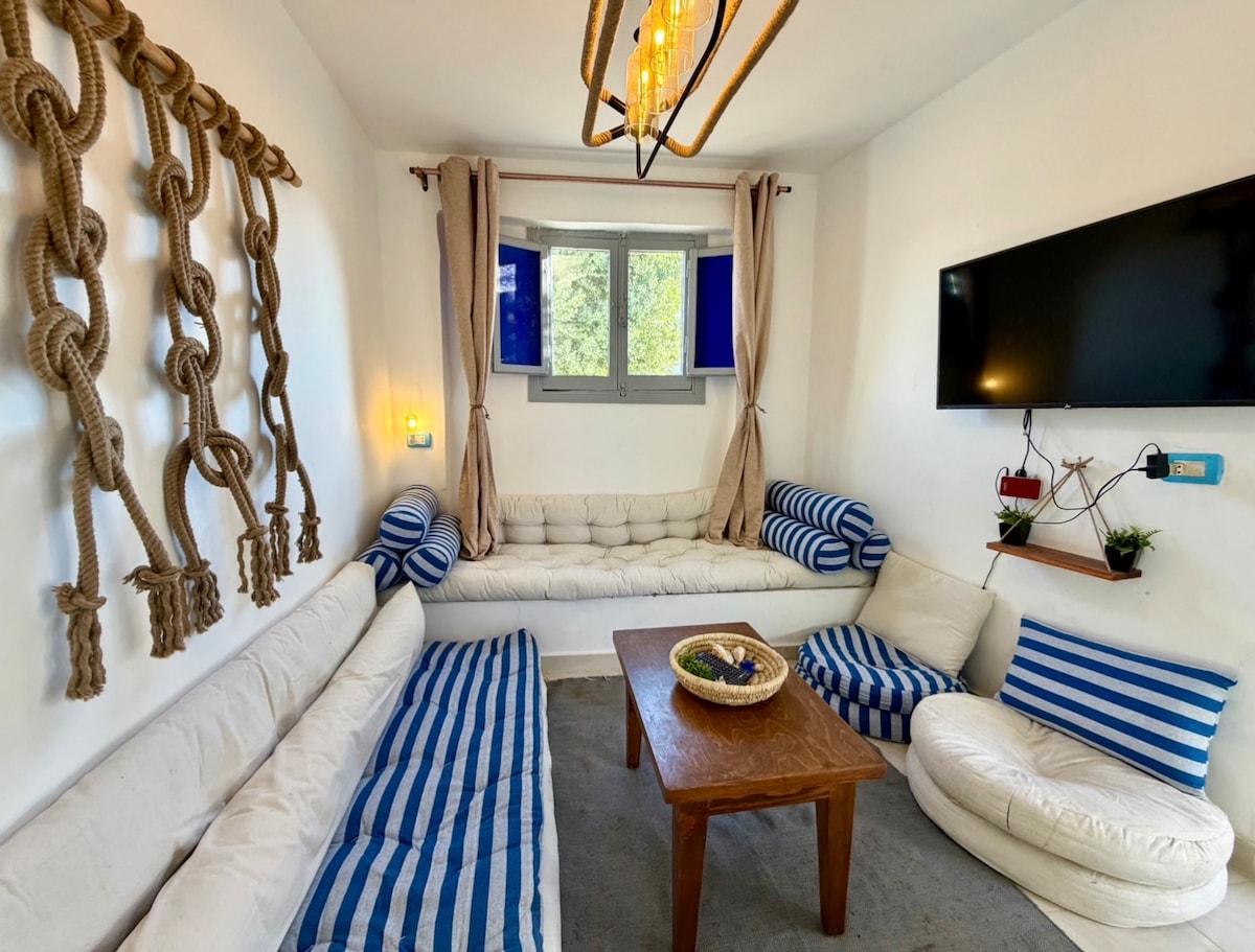 Experience Dahab’s boho lifestyle at Cozy Cushion Cove! This sun-drenched home is perfect for digital nomads & groups. Relax on the window seat, stream TV, or cook in the fully equipped kitchen. We offer luxury where it counts, like fast Wi-Fi & premium bedding, making it perfect for remote work. Unbeatable walkable location: 4 mins to Assala Square (cafes/shops), 7 mins to the Red Sea beach & 10 mins to Lighthouse dive sites. The perfect slow travel base for your Egyptian holiday escape!