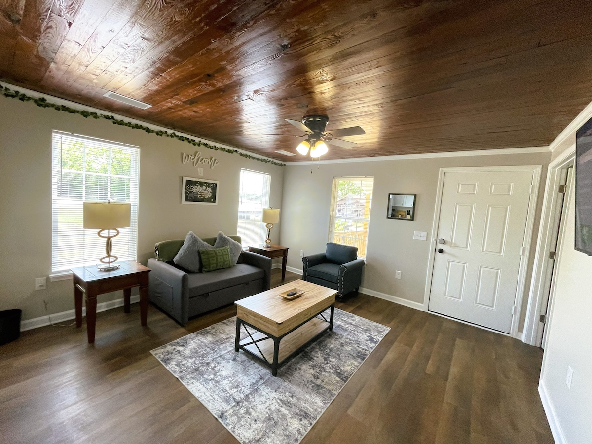 Vraiment comme à la maison loin de chez soi. Cette suite d'hôtes joliment décorée et meublée avec salle de bain privée, entrée et magnifique porche avant a tout ce dont vous avez besoin pour vous détendre et vous relaxer tout en visitant Ozark. La suite dispose de parquets, d'un lit Queen Size, d'un coin salon avec futon, d'une télévision connectée, d'une salle de bains complète et d'une kitchenette entièrement équipée avec réfrigérateur, micro-ondes, four grille-pain et cafetière Keurig. Notre suite est parfaite pour tous ceux qui recherchent un hébergement sûr et confortable tout en profitant de la région.