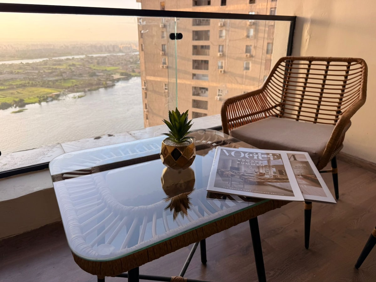 Appartements de luxe avec vue imprenable sur le Nil et vue sur le coucher du soleil et les pyramides. Profitez d'un logement élégant et central dans les nouvelles tours. Vous apprécierez de séjourner avec vos charmants invités dans le confort total de la maison classique. À 10 minutes du centre-ville (musée du Caire et Burj du Caire) #12 minutes d'AlMohandessin. #20 minutes des pyramides.