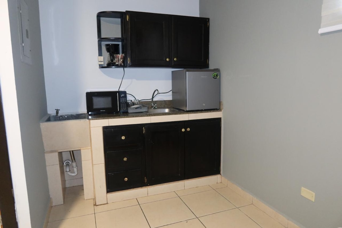 Suite avec entrée indépendante : parking couvert, lit double, salle de bain, kitchenette et bureau. Votre espace personnel au cœur de David. Il dispose de la climatisation split, d'un ventilateur de plafond, d'une télévision avec accès à Netflix, d'une connexion Wi-Fi gratuite, de rideaux occultants, d'un réservoir d'eau, d'eau chaude, d'une kitchenette équipée d'une cuisinière électrique, d'un réfrigérateur, d'une cafetière, d'un micro-ondes et d'ustensiles de base. Il n'y a pas de buanderie, de générateur électrique et d'isolation acoustique.