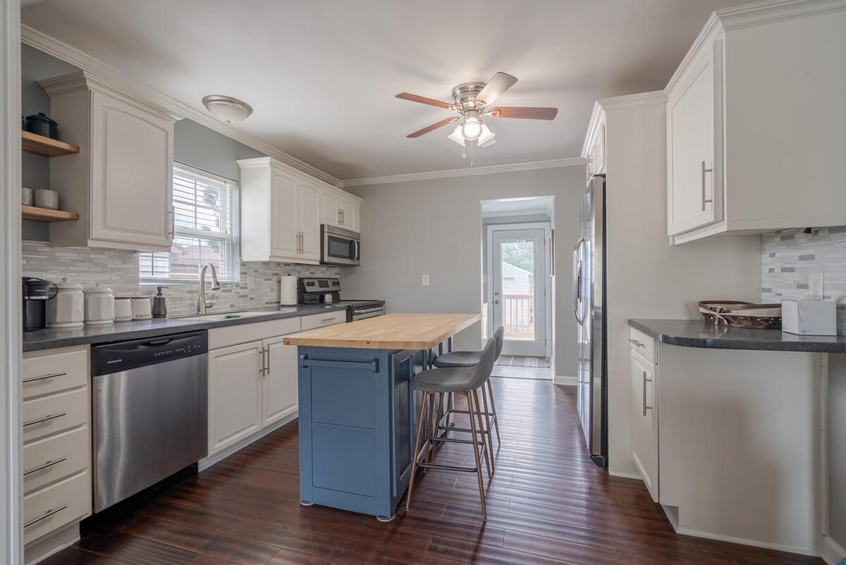 Créez des souvenirs dans cette maison rénovée de manière unique avec 3 chambres et 2 salles de bain ! Nous avons une chaise haute ! Table de ping-pong et table de jeu à l'étage ! La cuisine, la salle à manger et le salon sont ouverts. Il y a une tanière avec une télévision ainsi qu'une télévision dans le salon. 1bdrm dispose d'un bureau. Il dispose d'une grande terrasse avec une cuisinière à gaz et un barbecue ainsi que d'une table de patio ! Il est clôturé pour plus d'intimité ! Basketball, natation et centre de remise en forme de l'autre côté de la rue ! Vous allez adorer !