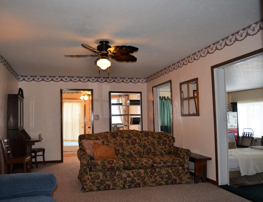 Notre logement plus petit ressemble à une chambre d'hôtel. Il dispose d'un lit queen et d'un canapé-lit. Vous avez votre propre petite cuisine. Un patio à l'avant qui donne sur la cour arrière et la cheminée. La petite salle de bain dispose d'une douche fabuleuse et de beaucoup d'eau chaude. Rempli de serviettes moelleuses et d'une literie confortable, cet endroit est vraiment un refuge. La kitchenette dispose d'un micro-ondes, d'un joli réfrigérateur à tranches et de nombreux autres ustensiles de cuisine et de vaisselle.