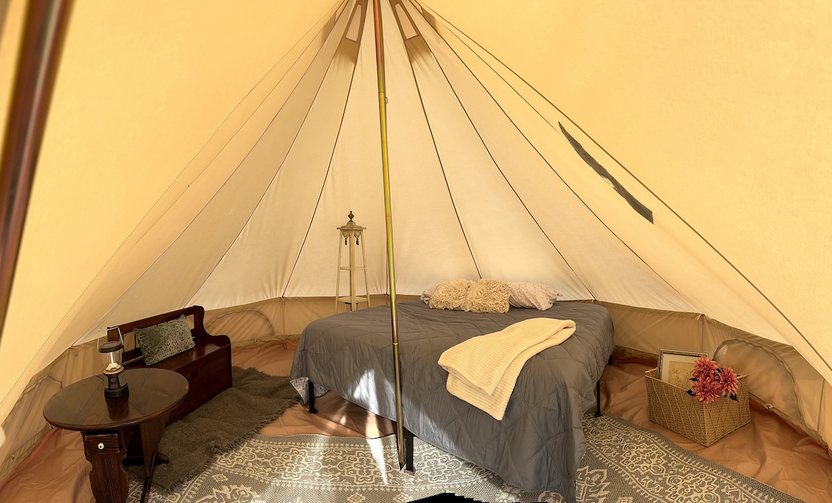 Venture to the endless mountains and relax in your own cozy glamping tent. Experience the perfect blend of nature and comfort—just bring your food and drinks. We provide a queen-size bed with soft sheets and warm blankets for a restful night’s sleep. Step outside your tent to unwind on your deck and take in some of the best sunset views in NEPA. HIGHLIGHTS ✓ Cozy space for two ✓ Stargazing, and (communal/shared) hot tub, outdoor kitchenette, fire pit ✓ Trails, views & outdoor peace
