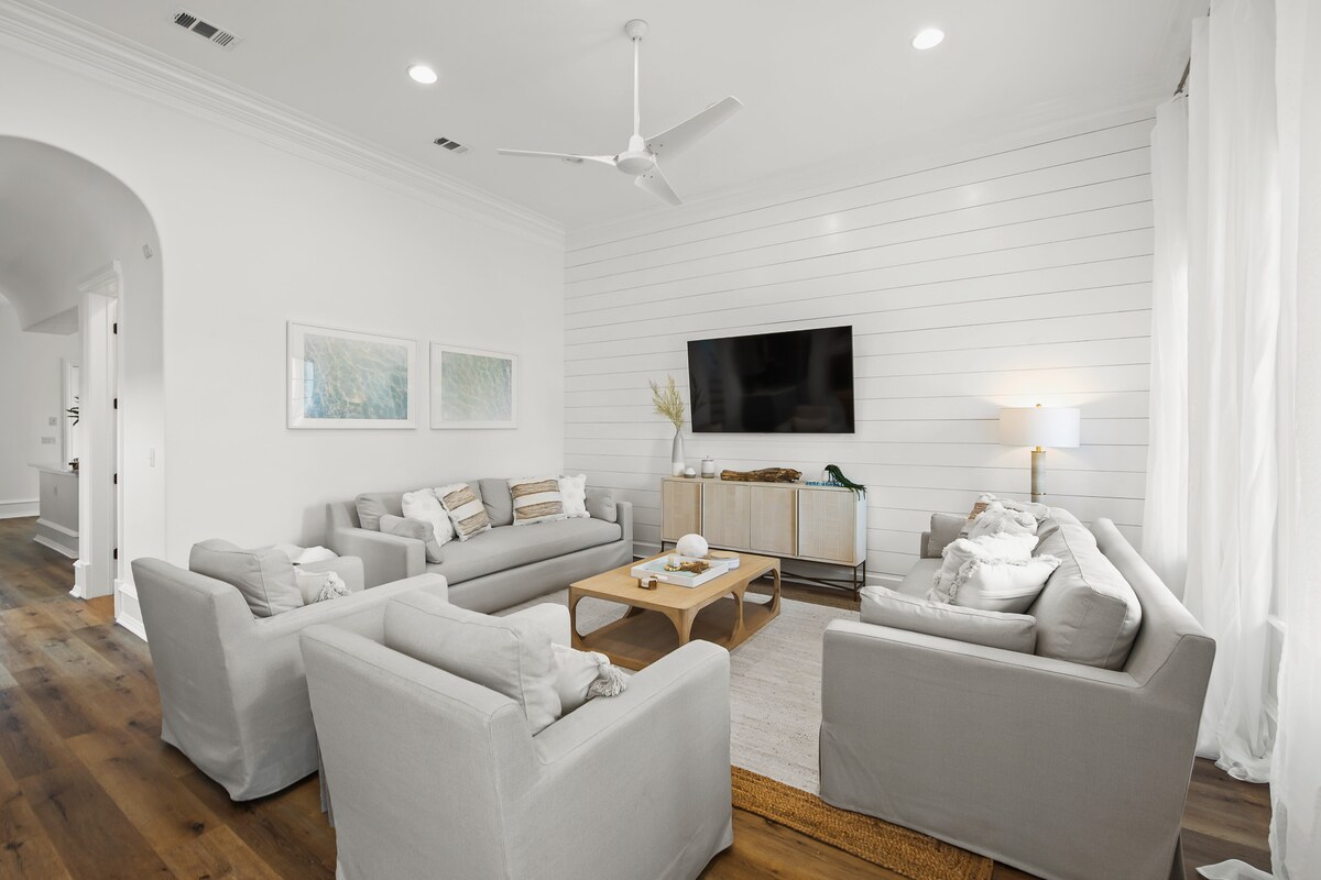Venez au paradis sur 30A ! Points forts : LA PLAGE EST (1/2 MILE DE DISTANCE) 5 lits, 4,5 salles de bain, 14 couchages À 0,5 miles des plages de sable BLANC Les conducteurs de voiturettes de golf 4 places doivent avoir 25 ans pour conduire. 4 vélos pour adultes. Piscine communautaire à quelques pas ! 2 patios/porches 5 lits King Size ! Chambre avec lits superposés au 3e étage 2 chambres principales avec salle de bain attenante Buanderie avec lave-linge/sèche-linge grande taille Roku TV dans chaque pièce (mots de passe à fournir) Wifi Espace bureau dédié ! Fantastiques boutiques et restaurants à proximité Emplacement !