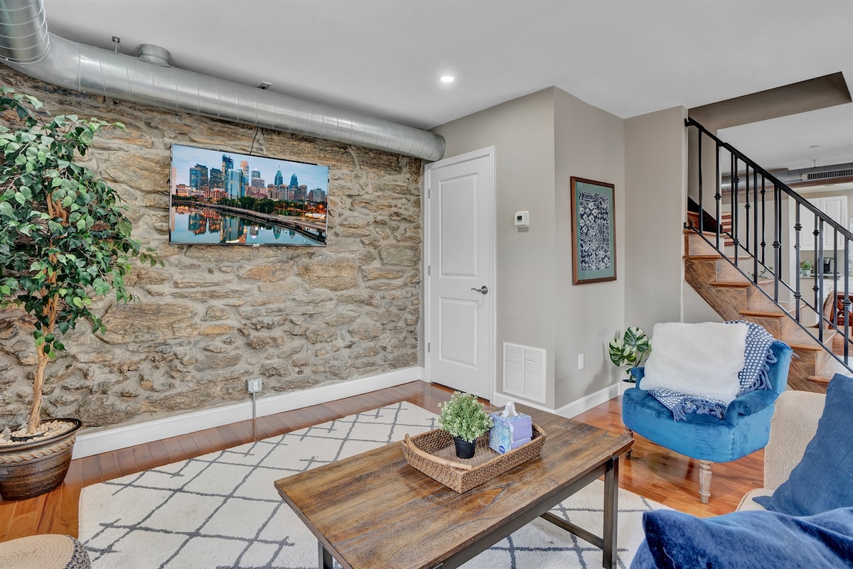 Notre chalet récemment rénové à Philadelphie est situé dans le quartier branché et passionnant de Manayunk. Profitez d'innombrables restaurants intérieurs et extérieurs, promenez-vous dans les boutiques de Main Street, faites du vélo et de la randonnée sur les sentiers locaux et à proximité. Asseyez-vous sur le patio arrière et regardez les événements d'en haut. Le parking privé est gratuit et sûr, et comprend une prise NEMA 14-50 pour votre véhicule électrique/hybride rechargeable. Veuillez apporter votre propre appareil enfichable. Licence commerciale n° 890 819 Permis de location n °893142