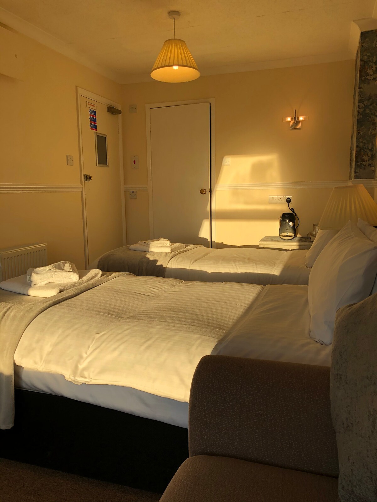 Une chambre plus grande, lit King Size confortable, salle de bain attenante, fenêtre, accès des voyageurs par des escaliers . réfrigérateur ,thé /café. Ventilateur, chauffage. Télévision. Wifi . Nous acceptons les chiens bien élevés pour un coût de 12 £ par nuit payable lors de la réservation. Les enfants ne sont acceptés que sur demande , des frais par nuit s'appliquent. Vérifiez avant de réserver s'il vous plaît. Petit déjeuner gratuit composé de céréales, de croissant , de fruits et de café disponible dans le salon des invités. Petit déjeuner cuisiné à la carte dans le café/bar en bas, du 9 au 5