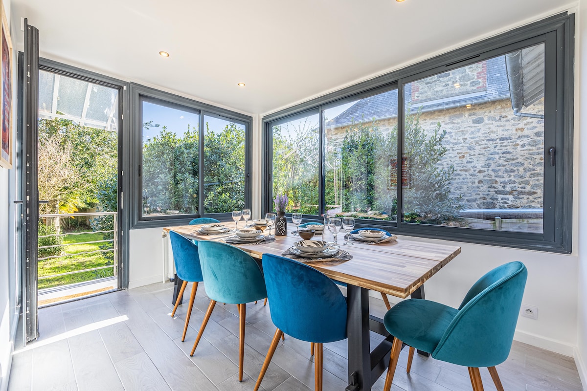 Petite maison de caractère en granit avec terrasse ensoleillée et vue sur le jardin située dans le quartier très calme de St Enogat à Dinard et à 500 mètres de la plage de St Enogat . Convient parfaitement à une famille de deux jeunes enfants Pendant les vacances scolaires, la maison est louée à la semaine du samedi au samedi Le jardin de 700 m2 peut être partagé .