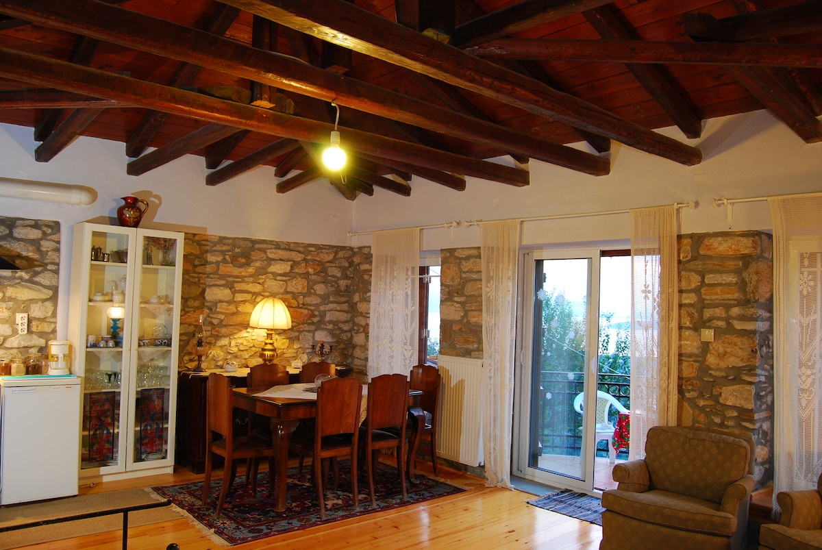 Une maison traditionnelle en pierre dans le centre du village de Saint George sur le mont Pélion, tout en ayant une intimité parfaite. Un petit studio-maison, à côté d'un ruisseau de montagne, idéal pour un séjour frais pendant l'été chaud grec. Verdure luxuriante, grande cour avec une vue magnifique sur le village et la mer. - Il n'y a pas de wifi (pour l'instant). Profitez de la nature !