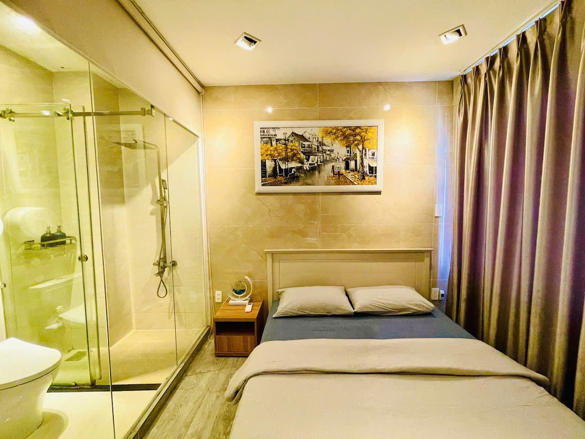 The space THE MAIN STREET VIEW - 25m2 - 24/7 - Special: Complimentary coffee is available from 9:00 AM to 3:00 PM Enjoy a soft queen bed, private bathroom with a rain shower, air-conditioner, fridge, kettle, desk & chair. Unlimited high-speed Wi-Fi and a Smart TV with Netflix & YouTube for your entertainment. Free welcome purified water and elevator access included. We also provide essential amenities such as a comb, toothbrush, toothpaste, and more — just bring yourself!