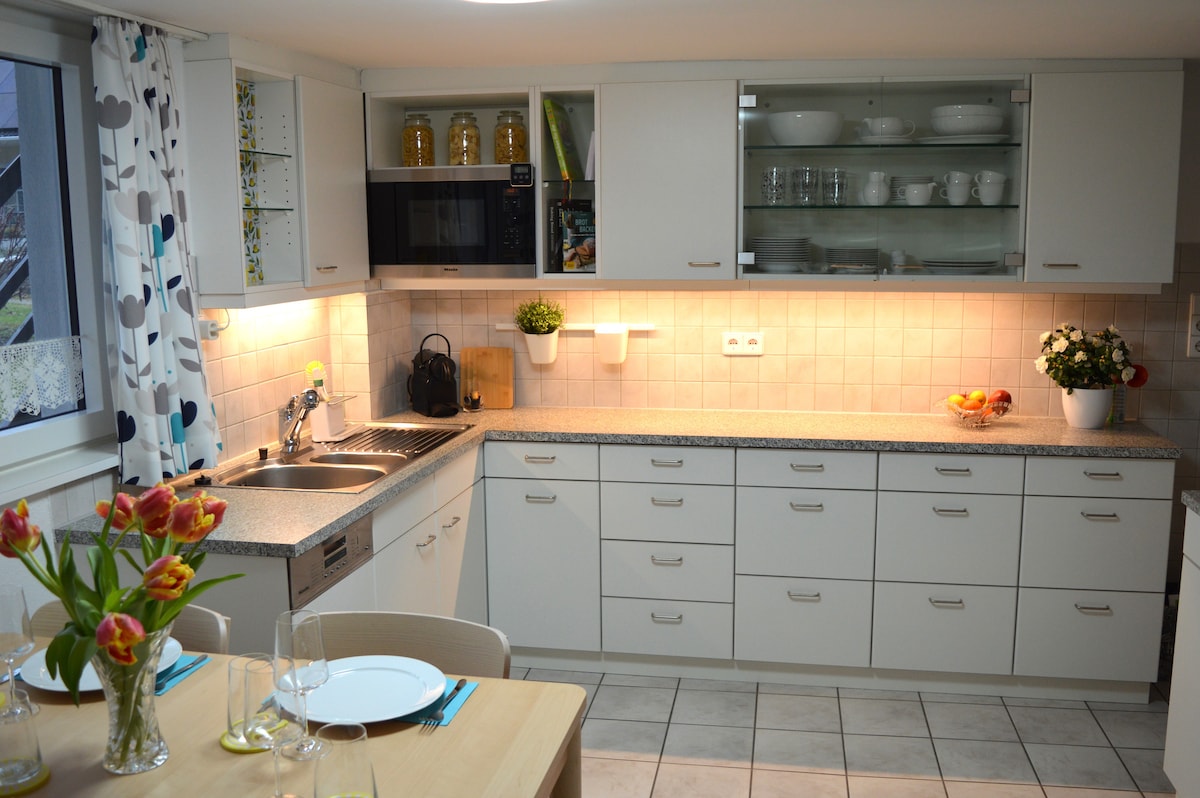 Willkommen in Ihrem stilvollen Rückzugsort! Diese geschmackvoll eingerichtete Wohnung im 1. OG bietet Wohnzimmer, gemütliches Schlafzimmer, praktisches Arbeitszimmer und einer voll ausgestattete Küche. High-Speed-WLAN, Garage und ein idyllischer Garten, nutzbar in den warmen Monaten, sorgen für Komfort. Ruhige Lage, 8 Minuten ins Zentrum, nahe Rhein und Schweizer Grenze. Ideal für Geschäfts- und Urlaubsreisende: für 3 Gäste mit Doppelbett und komfortabler Schlafcouch. Streaming-TV inklusive.