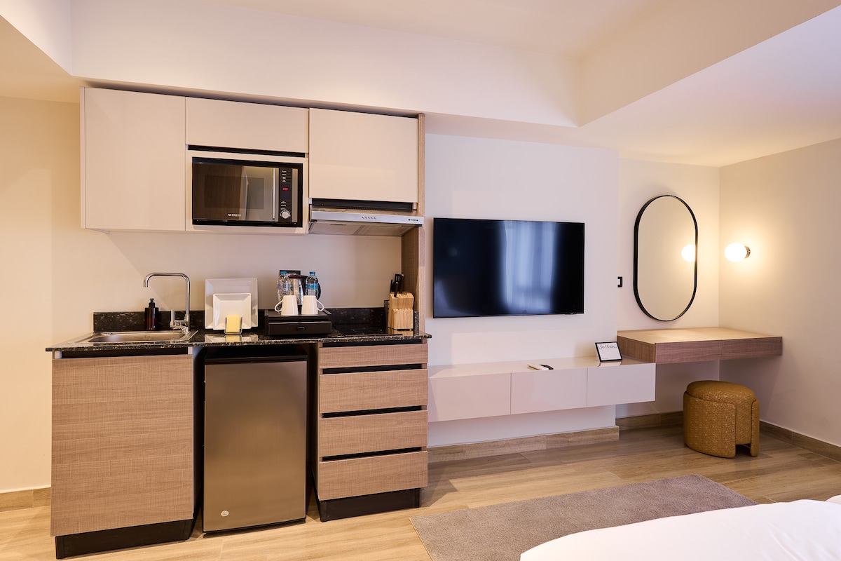 La chambre dispose d'une salle de bain privée. La chambre est spacieuse, climatisée avec 1 lit Queen Size confortable et une armoire. Le salon dispose d'une télévision à écran plat, d'une connexion Wi-Fi gratuite, d'une télévision par câble, d'un minibar et d'une bouilloire. La salle de bain est propre et moderne. La propriété fournit aux voyageurs des draps propres, des serviettes et des oreillers supplémentaires. La chambre dispose également d'un canapé qui peut être facilement ouvert pour devenir un lit confortable pour un voyageur supplémentaire.