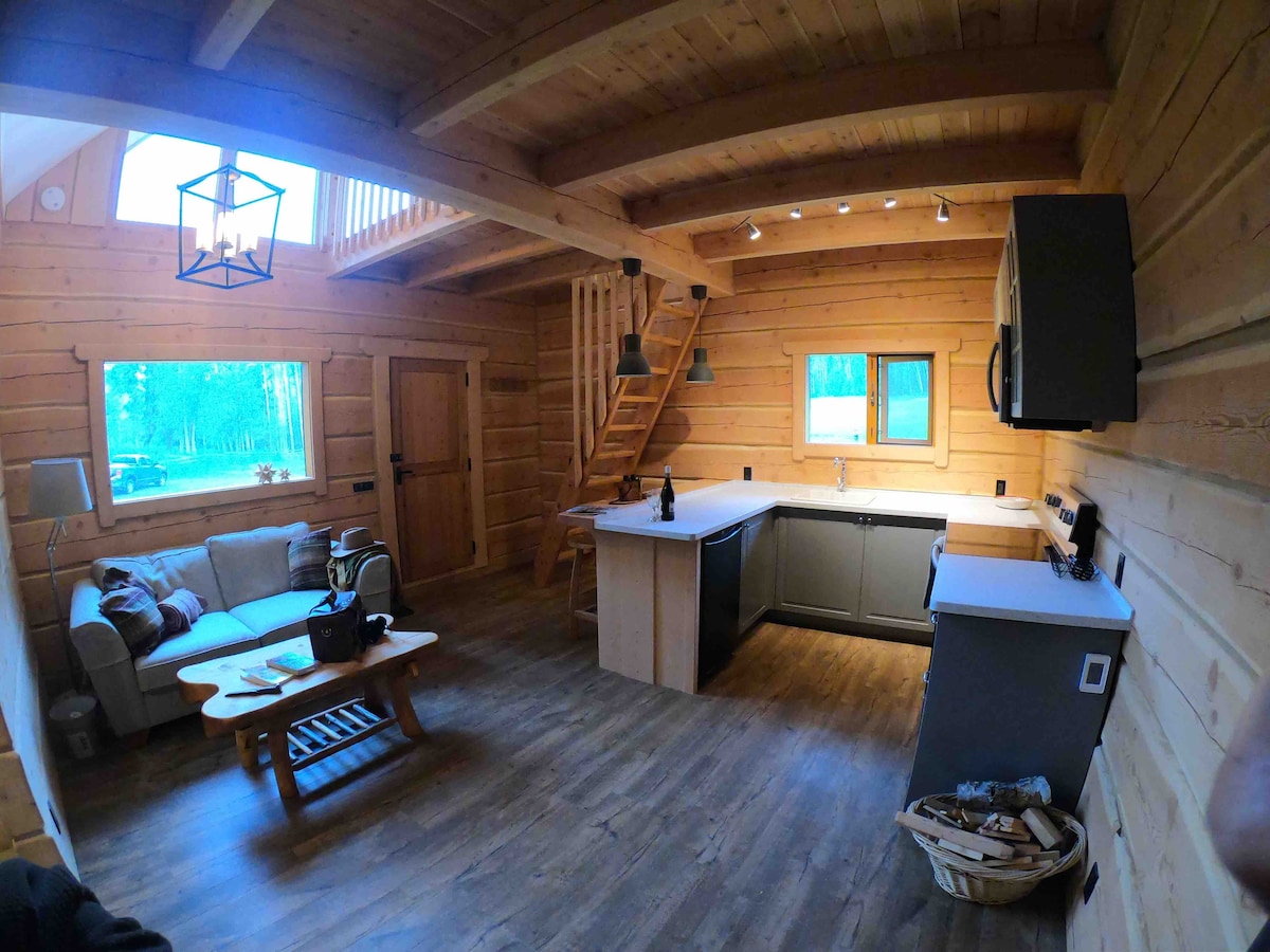 Cette cabane lumineuse d'une chambre au charme rustique est située dans une zone boisée, juste à l'extérieur de la ville de Golden, en Colombie-Britannique. En tant que plus petit de tous les chalets Wild Wood, la disposition de Deer Crossing est confortable et compacte, parfaite pour deux personnes. Il y a une chambre à coucher ouverte à l'étage avec un lit Queen Size et une salle de bain. En bas, la cuisine et le salon partagent un espace ouvert. Un canapé-lit est inclus pour un voyageur supplémentaire. Deux terrasses couvertes permettent également de passer des moments plus agréables à l'extérieur.