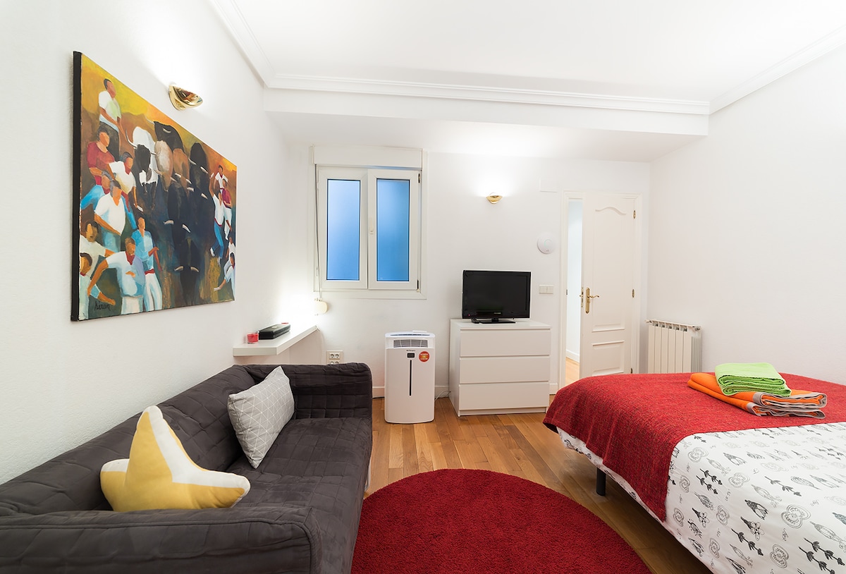C'est un beau studio, entièrement équipé en plein cœur de San Sebastian, à proximité de toutes les commodités, à distance de marche de la plage: baie de La Concha, ainsi que Zurriola, (plage de surfeur), magasins, gares ferroviaires et bus, mais il est calme, car il n'est pas face à la rue. Veuillez noter que les fenêtres de ce studio sont sur un patio et non pas dans la rue.