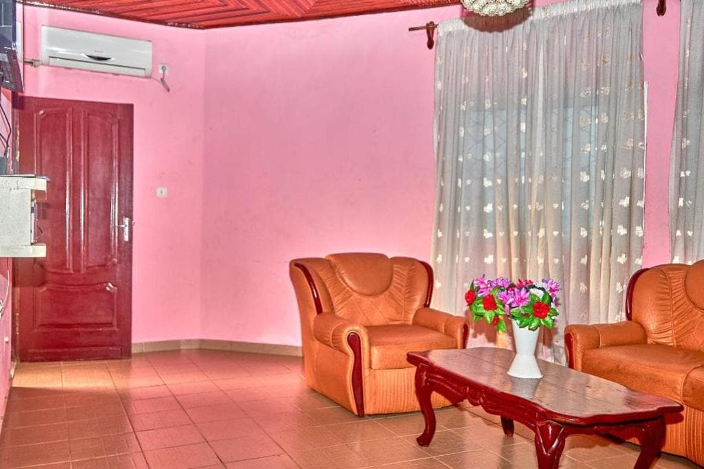 Situé dans un quartier résidentiel Ô MBOA vous accueille à 80 m du goudron dans une ambiance paisible et chaleureuse. Ce logement calme et élégant vous offre en plus de votre appartement un espace extérieur pour manger ou vous détendre. Des protections anti moustiques sont aux fenêtres et il y a un forage pour pallier à d'éventuelles coupures d'eau. À 10 min en voiture vous avez de nombreux centres commerciaux à moins de 10 min de nombreux restaurants et vous êtes à 30 minutes du Centre-ville.