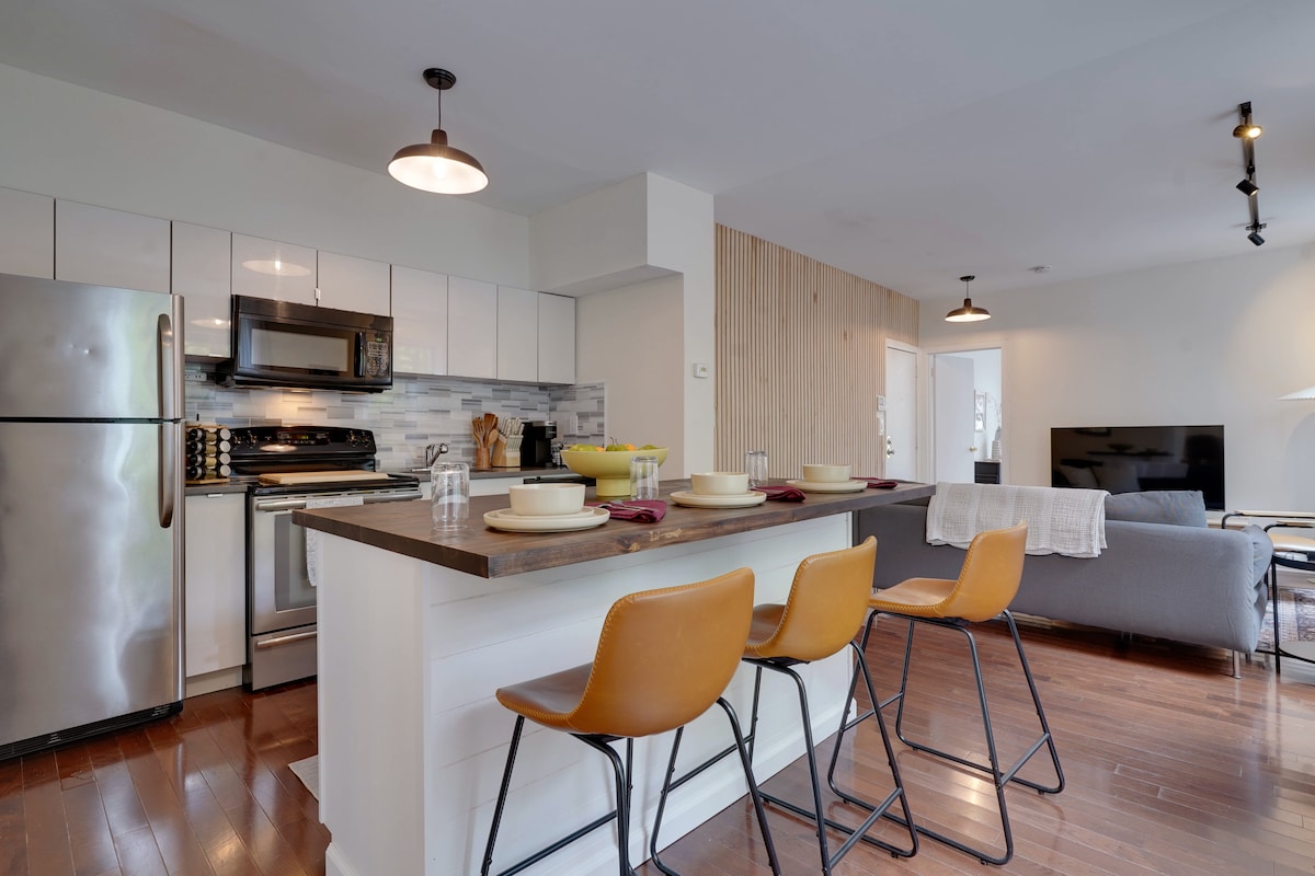 Appartement élégant, spacieux et luxueux à Wooster Square, New Haven. À quelques pas de Wooster Street/Little Italy, de Sally's et Pepe's apizza, de la cuisine et des pâtisseries italiennes. Parfait pour explorer Yale, New Haven, le centre-ville et le littoral du CT ! L'annonce présente un superbe loft de 1700 pieds carrés avec 2 chambres dans une ancienne usine d'embouteillage de Coca Cola, rénovée par un architecte avec des caractéristiques d'origine, chauffage central/climatisation, cuisine équipée, baignoire de luxe et baignoire, Wi-Fi haut débit avec télévision connectée. Parking gratuit hors de la rue ! Hôtes locaux 5 étoiles !