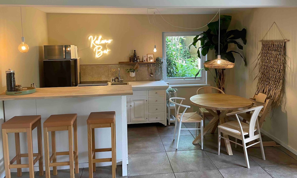 Bienvenue dans notre oasis de jardin ! ☀️ Chez nous, vous pouvez vous détendre dans votre retraite moderne et hyggelige au rez-de-jardin de notre maison. Accès privé et jardin avec terrasse. Nous vivons au-dessus avec notre petit chien et notre enfant ☺️ Conçu avec amour, vous disposez d'un salon avec coin repas et cuisine et bar, d'une chambre, de toilettes, ainsi que d'une salle de bain avec douche. Important : les fumeurs/vapoteurs ne sont pas autorisés à réserver chez nous par respect pour nous et pour tous les clients suivants !