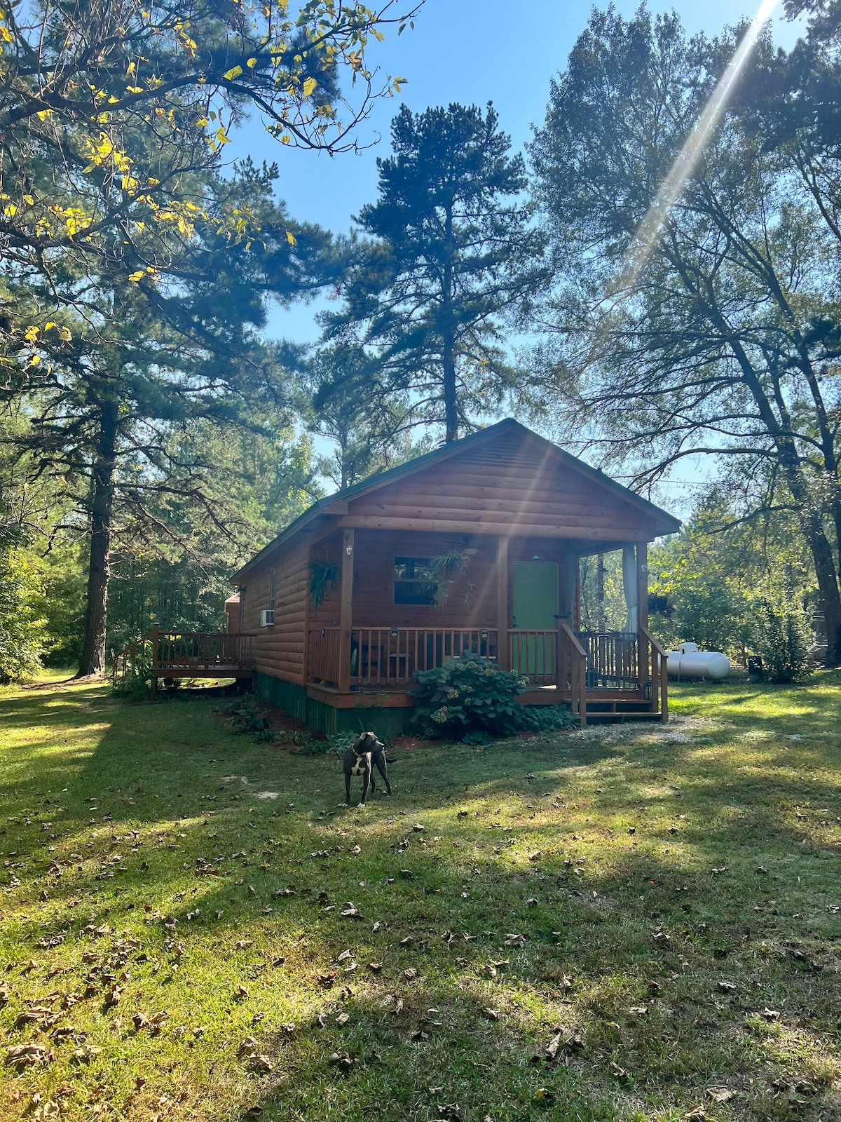 Détendez-vous en famille et entre amis sur un lac de 40 acres rempli de basse et de bord. Admirez le coucher de soleil depuis le spacieux porche. Nous sommes à 4 miles de l'autoroute et à 14 miles du lac Grenade. La pêche est prise et remise à l'eau. Des bateaux, un kayak et des canoës peuvent être loués moyennant un supplément. De l'autre côté du lac, il y a un hangar à bateaux et une rampe de mise à l'eau. Il y a une structure de quai plus ancienne dans le lac qui ne doit pas être utilisée. Notre maison est également sur le lac en face de la cabine.
