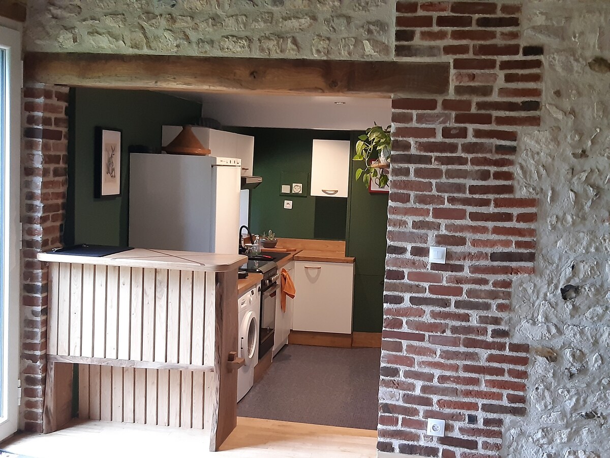 Charmant four à pain ancien en colombages, situé en bord de ruisseau il se compose de : - Salon avec un poêle à bois, - Cuisine, - A l’étage : -salle de douche/WC accessible par une échelle de meunier (voir photos), -chambre avec un lit 160x200 avec vue sur le ruisseau, accessible par une échelle de meunier (voir photos), Chambre et salle de bain ne communiquent pas. Salon de jardin, BBQ, parking privé, bois de chauffage inclus Note autre gite, la Maison de pierres, est à 100m