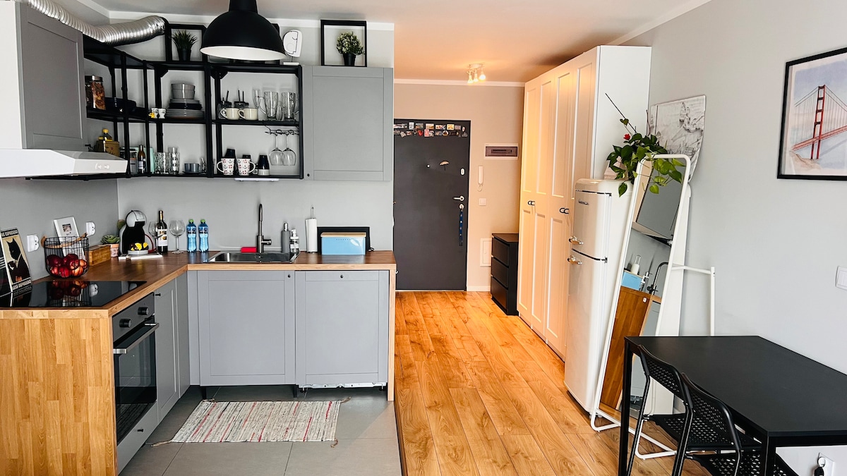 Appartement 1 chambre joliment décoré avec un salon spacieux avec annexe cuisine et une grande salle de bains. Proche de la gare (à seulement 7 min en voiture du centre-ville), de l'aéroport de Balice (10 min en train direct) et de plusieurs transports. Climatisation. Parking souterrain gratuit, ascenseur dans l'immeuble. L'appartement est situé dans un quartier très bien entretenu. Plusieurs magasins et restaurants locaux à proximité. Terrains de tennis dans le quartier. Idéal pour une escapade de week-end ainsi que pour un séjour plus long.