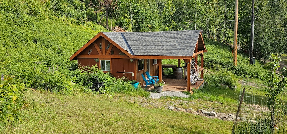 Séjournez dans notre spacieuse suite rustique en rondins dans un cadre paisible et privé, entouré d'un jardin fleuri bordé de rochers et d'une forêt de sapins, mélèzes et cèdres. Profitez d'une vue partielle sur les montagnes depuis le patio. Visitez notre ferme d'agrément et dites « bonjour » à nos animaux sympathiques :) Nous sommes situés en bordure de la ville, à seulement 5 minutes des cafés, des magasins et de la plage dans le centre-ville pittoresque de Nakusp. Nous sommes à seulement 3 min en voiture du terrain de golf et à 20 min des sources chaudes de Nakusp.