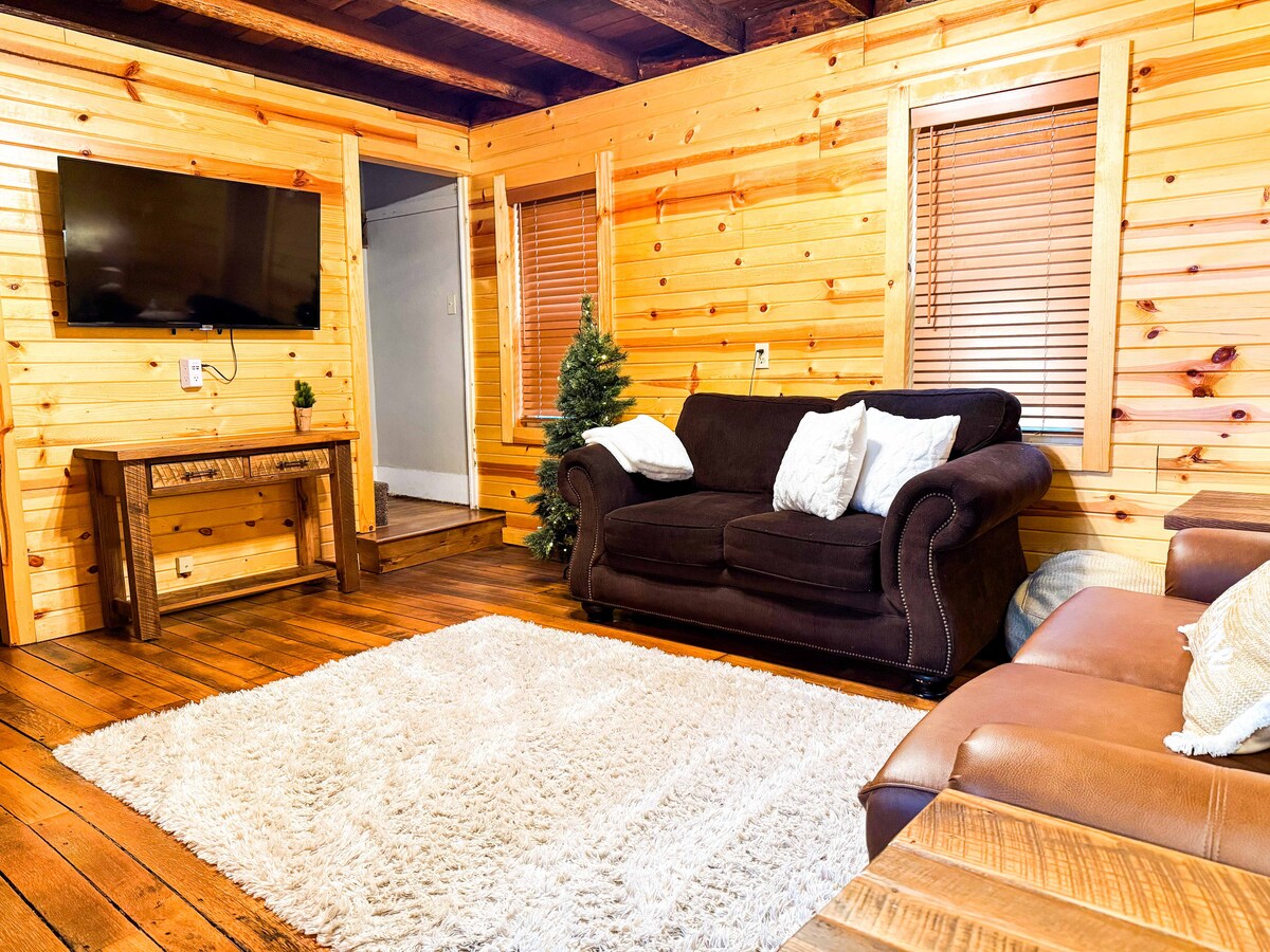 Black Rock Cabin est une cabane historique en rondins qui a été entièrement rénovée. Doté d'un étage principal ouvert avec salon, salle à manger et cuisine. À l'étage se trouve une chambre complète et une salle de bain. Découvrez la douche carrelée avec sa tête de pluie douce, puis détendez-vous à côté d'un feu de bois crépitant dans le salon. Profitez de la cuisine du coin avec une cuisinière, un four, un réfrigérateur, un four à micro-ondes et une cafetière. Asseyez-vous à la table à manger rustique ou retirez les tabourets de bar au comptoir.