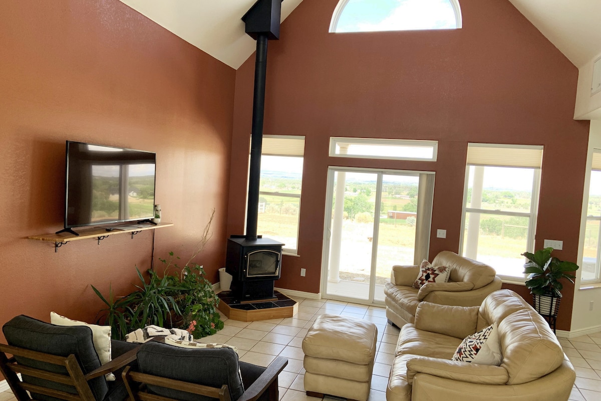 Retirez-vous dans cette escapade sereine située sur la crête arrière d'une superbe propriété de 87 acres. Admirez la vue panoramique, qui comprend les montagnes La Platas, Mesa Verde et Ute. Explorez la région des Quatre Coins, puis revenez vous détendre dans le sauna intérieur, profitez de couchers de soleil à couper le souffle et terminez la journée près de la cheminée. Bien que les commodités ne soient qu'à 7 minutes en voiture, le quartier est paisible et isolé. Profitez en famille de ce fabuleux logement qui offre de bons moments en perspective.