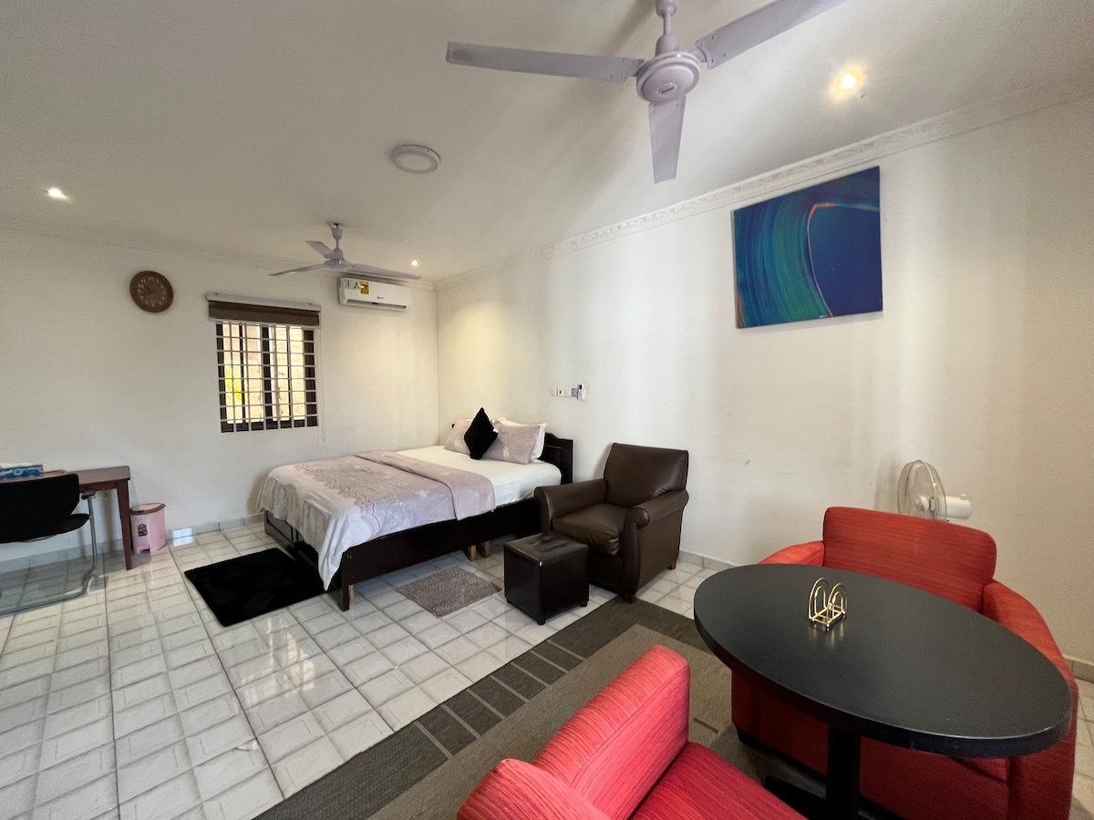 1 chambre avec climatisation, ventilateur et réfrigérateur