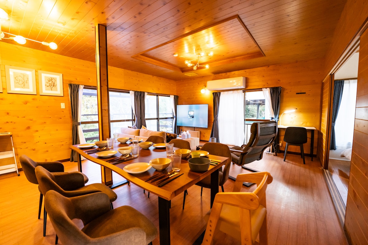 Parfait pour les familles et les groupes ! Séjournez près des sources chaudes célèbres et profitez de baignades relaxantes. Un parking gratuit est disponible. Un espace barbecue couvert (1 000 ¥ ) vous permet de griller même pour les journées pluvieuses. La maison entière est réservée à un seul groupe, assurant intimité et confort. Environs : Entouré par la nature avec des sanctuaires, des parcs, de la pêche, de l'observation des oiseaux et de la randonnée. La nuit, profitez d'un ciel étoilé. Totoro est à côté, un délice pour les enfants et les fans de Ghibli. Des promenades avec vue sur les montagnes de Kirishima sont également à proximité.