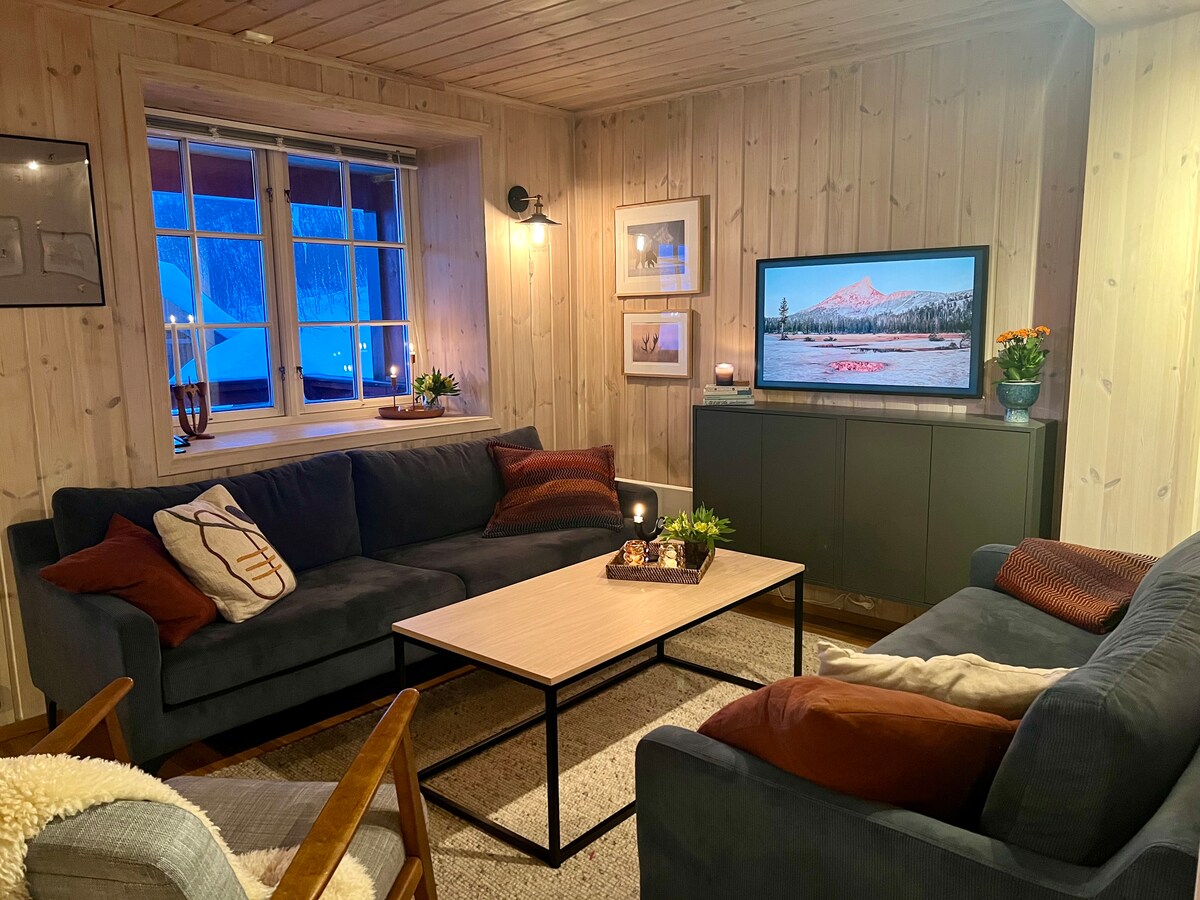 Cosy cabin with a fantastic location and its own shoreline by Lake Totak. The cottage has 2 bedrooms, a spacious living room with a corner sofa (can also be used as a sofa bed if needed), a cosy fireplace, a large dining table, a loft, a well-equipped kitchen and a bathroom with a shower and washing machine. Large terrace with a dining table and a view of the lake and the mountains. We have our own marina, boat ramp and a boat, 2 kayaks and 2 SUPs that can be rented. 15 min to the ski centre.