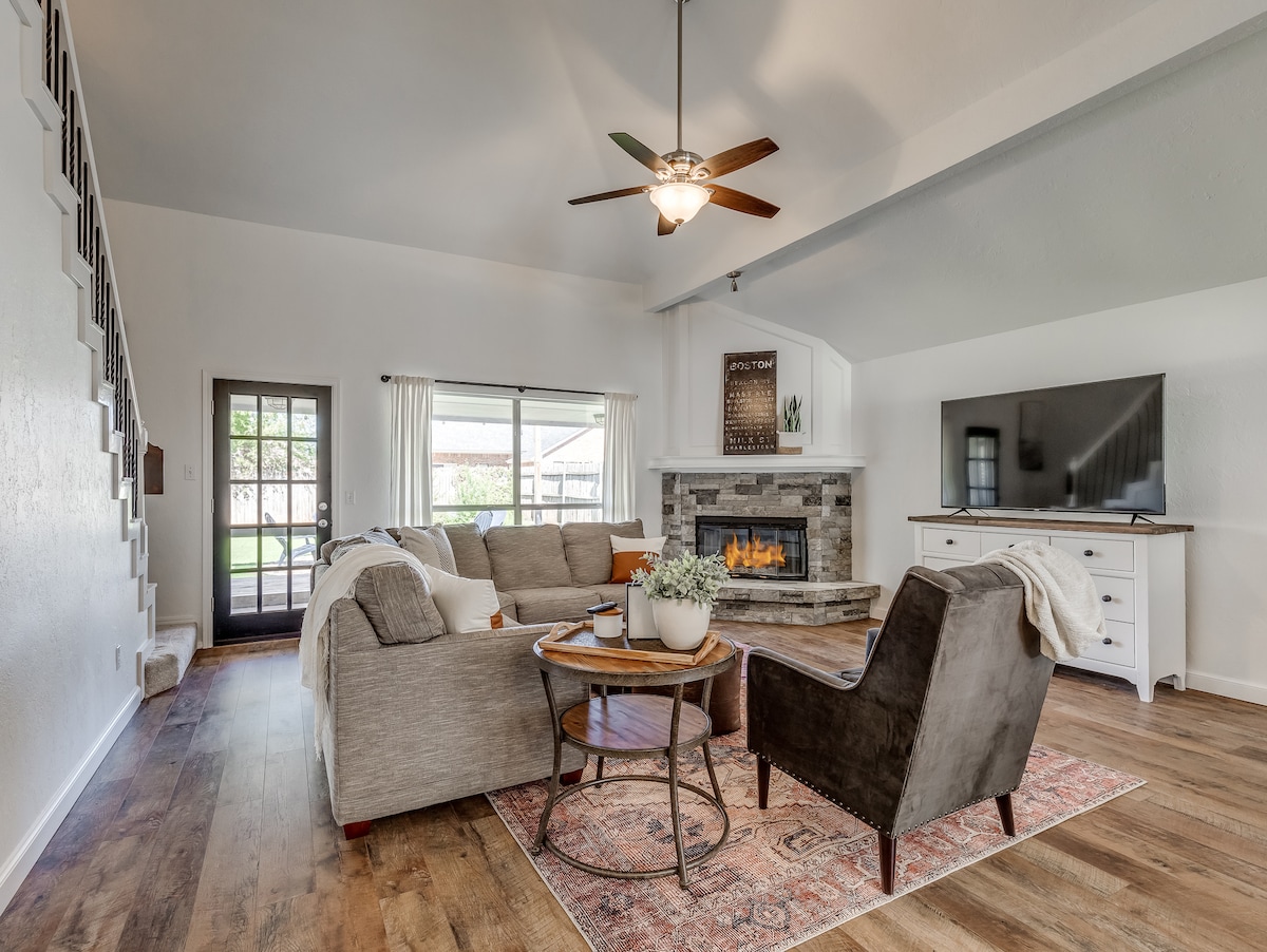 This home has been remodeled with stylish, comfortable details. Warm, wood floors and gorgeous fireplace in the open living room. Fenced back yard with fire pit and grill for gathering with friends and family. Cozy, upstairs loft with smart tv. Stairs are steep so keep that in mind for small children. Garage to park in with storm shelter. Huge, walk in shower in master along with double vanities. Bedrooms are downstairs with gel memory mattresses and white linens. Ring camera front for safety.