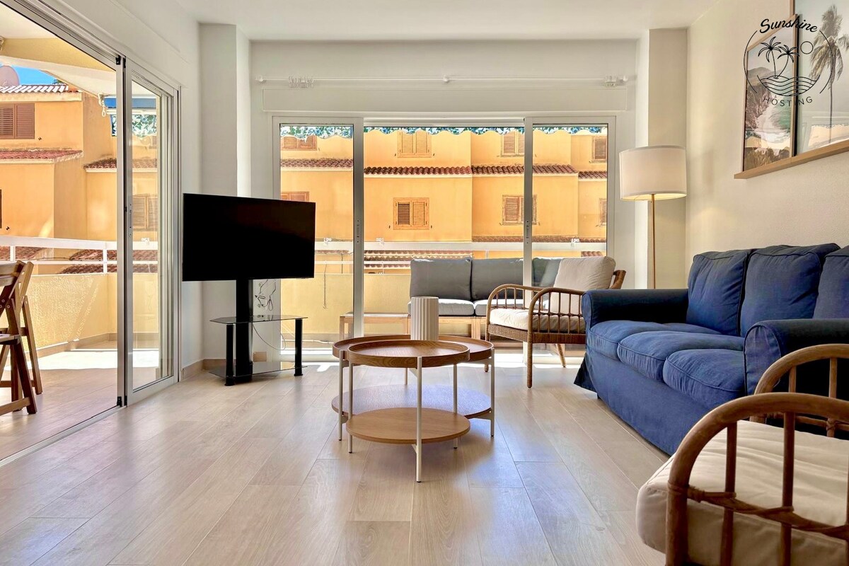 Un bel appartement climatisé/chauffé, bien équipé, situé au centre, avec 2 chambres et 2 salles de bains. Linge en coton égyptien croustillant. Patio spacieux avec vue sur la mer, coin salon, coin repas, chaises longues et accès facile à la piscine. Accès par ascenseur et escalier au niveau de la plage ou de la ville. Parking couvert gratuit au même étage. Télévision par câble avec 170 chaînes et clé Fire TV, Internet haut débit. Pas de frais de service ou de nettoyage. Parfait pour les couples et les familles
