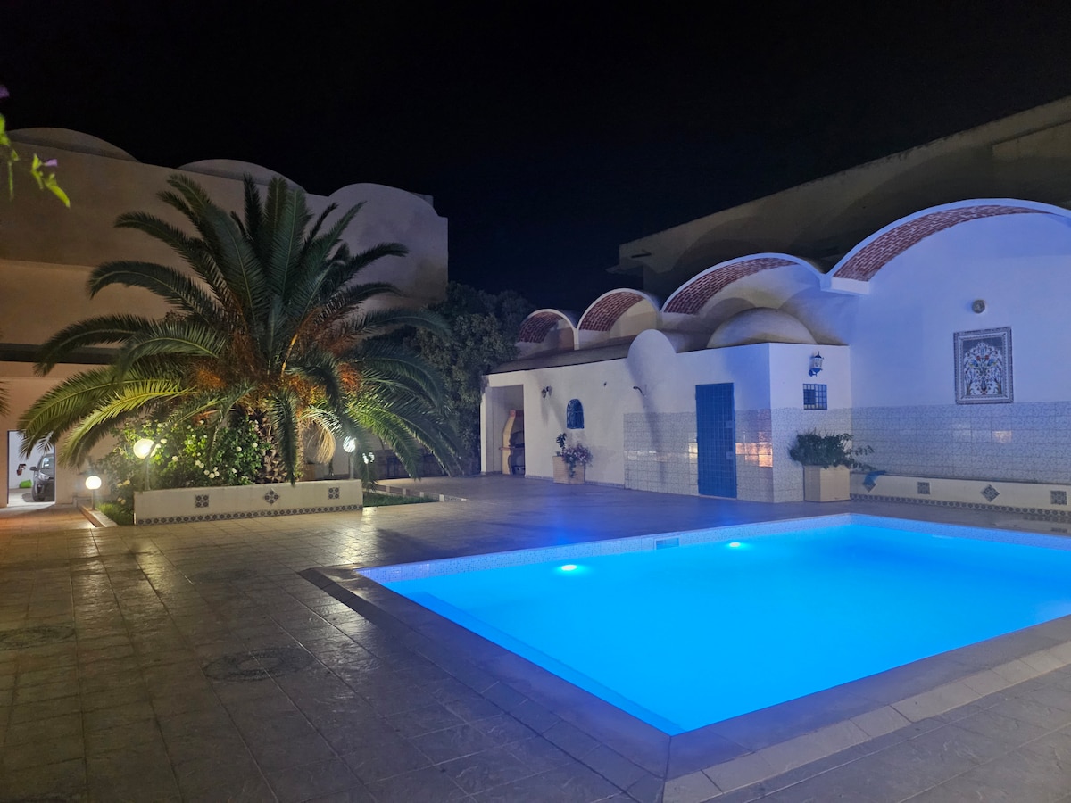Offrez-vous un séjour relaxant dans notre villa spacieuse à 5 min à pied de la Magnifique plage vierge de Chatt Ezzouhour à Korba. et à 25 min de Kélibia. Située dans une zone paisible, elle comprend 2 salons, 2 cuisines équipées, 4 chambres, 3 salles d'eau. À l'extérieur : piscine 7x4.5, terrasse avec pergola, barbecue, douche extérieure, jardin, abri des voitures. Climatisation et Wi-Fi inclus (entièrement). Pour infos/réservation : Contactez Souhail Jouini
