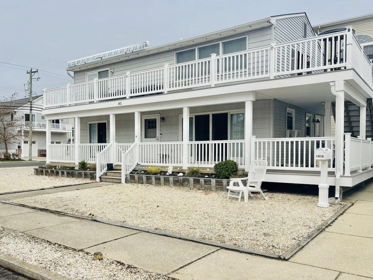 Modern, light, and airy ...Beach Block in center of Sea Isle City. New kitchen with everything you need. Two comfy couches, table that seats six, and fast WiFi. Two full bathrooms make hosting easy. Front porch has partial ocean view; Wawa, mini-golf, ice-cream, restaurants, and bars are walking distance.