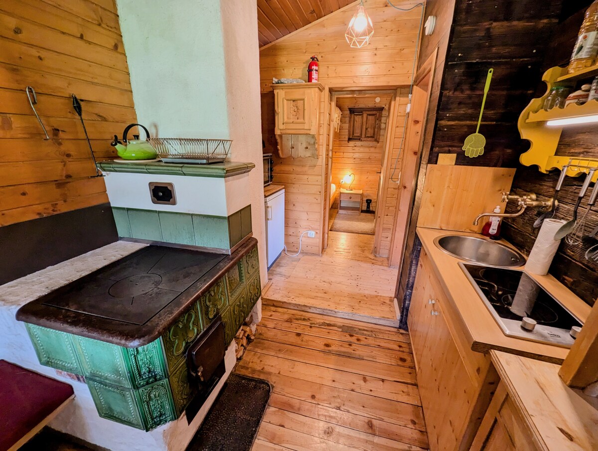Cabane en rondins de 100 ans, qui a été démolie en 2008 dans le village voisin et reconstruite chez nous à la ferme biologique de montagne. Une attention particulière a été accordée à l'utilisation de matériaux de construction naturels (roseaux, crépi d'argile, vieux bois). Le toit est recouvert de bardeaux de mélèze traditionnels. La maison est chauffée par une grande cuisinière et un système solaire thermique, la salle de bain dispose d'un chauffage au sol. La petite maison confortable (75 m²) nous a servi de résidence pendant 10 ans.