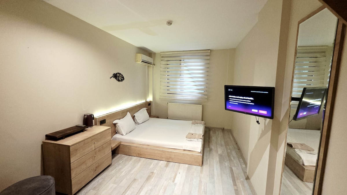 Ce charmant appartement hôtelier offre un mélange unique de simplicité et d'élégance avec son design moderne et raffiné. Parfait pour deux personnes ou un couple, il comprend un lit double confortable, une kitchenette bien équipée, une salle de bain privée et une télévision connectée de 40 pouces. Grandes fenêtres. Idéalement situé à quelques pas de la côte d'Ortaköy, du pont du Bosphore, des célèbres magasins de kumpir et de gaufres, et du cœur historique d'Ortaköy dans le centre d'Istanbul.