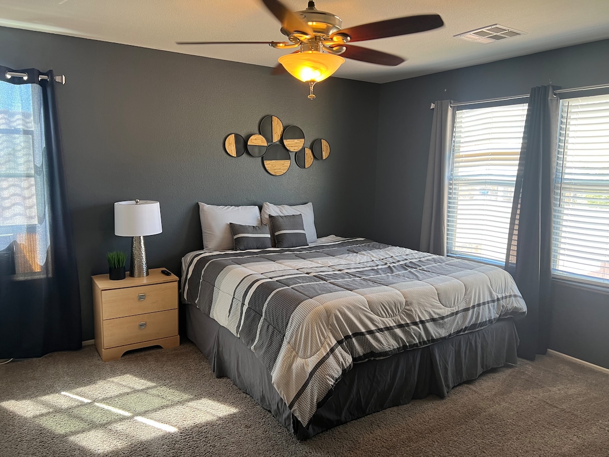 La maison est une maison de plain-pied avec 3 chambres et 2 salles de bain complètes. Elle est à 2 minutes en voiture de l'autoroute 215. Vous trouverez une variété d'endroits à moins de 10 minutes en voiture, tels que le Sunset Park, la place de la ville et les magasins South Premium Outlets.