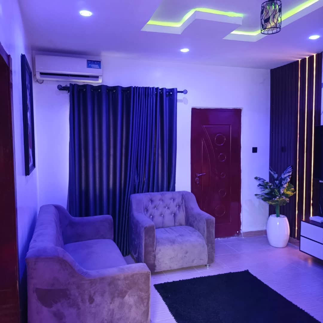 Ce logement unique a un style qui lui est propre. C'est un appartement avec service de 1 chambre et salon. Les équipements comprennent : - Alimentation 24h/24 - Extracteur de fumée - Micro-ondes - Caméra de vidéosurveillance - DSTV/Netflix - Console TV - chauffe-eau - planche de billard - ping-pong - lave-linge - Grande place de parking - Chaises de lecture et tables - Cuisinière à gaz - Congélateur