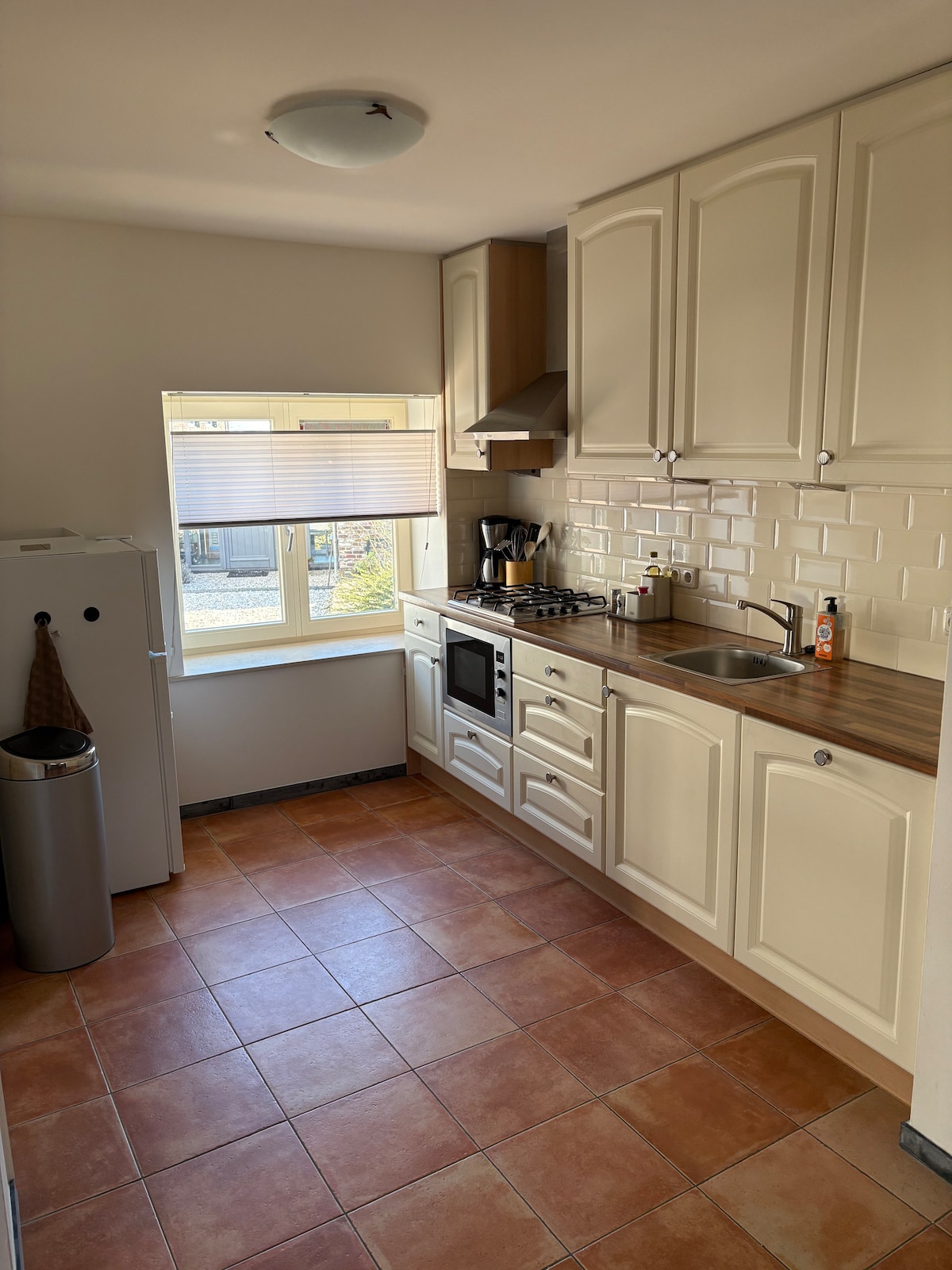 Cette maison mitoyenne fait partie de la partie résidentielle de notre ferme (ferme laitière), et est située sur une route sans issue avec une vue magnifique sur les prairies environnantes et le paysage vallonné 5* unique. Le salon de la maison est à l'étage, situé sous le toit au 3ème étage. (salon, cuisine et salle de bain avec baignoire). Vous avez ainsi une vue dégagée sur les prairies et la belle campagne du Limbourg.