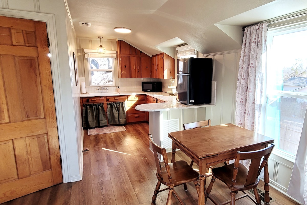 Le Compass Loft est un appartement garage à l'ÉTAGE récemment rénové avec un thème vintage/boho/voyage qui reflète l'esprit de nos autres annonces Compass et se trouve à 3 pâtés de maisons de TSU. Le Compass Loft dispose de sa propre entrée privée. Les seuls moments où nos chemins pourraient se croiser sont dans l'allée ou au pied de l'escalier. Le plan d'étage de style studio dispose d'une salle de bains privative et d'une kitchenette avec un évier, un Keurig, un four à micro-ondes, un grille-pain et un mini-réfrigérateur pour conserver vos restes. Nous avons également un chargeur pour véhicule électrique si nécessaire.