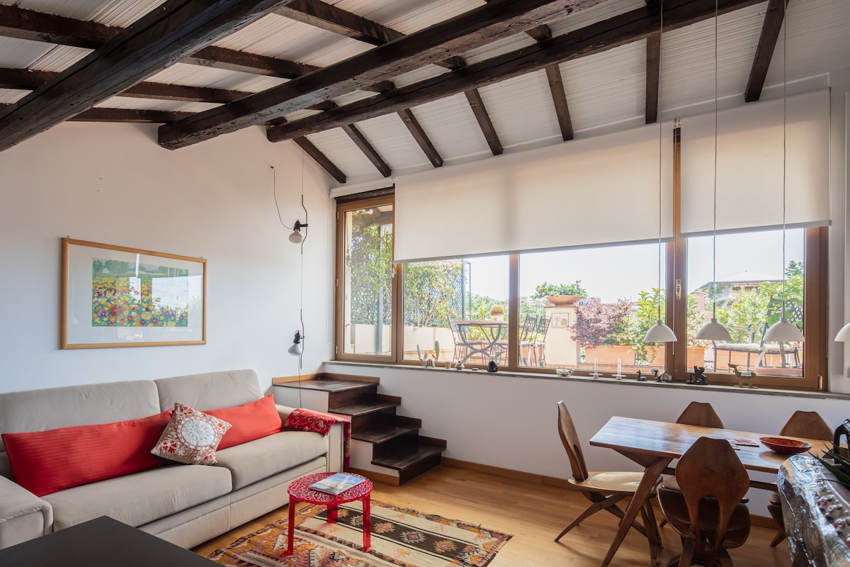 Charmant penthouse à quelques pas du Colisée, dans le centre historique de la ville, surplombant les toits de Rome d'où vous pourrez admirer une vue panoramique incroyable. Emplacement spécial, pour le voyageur solitaire, pour l'artiste en quête d'inspiration, pour le professionnel qui veut une maison loin de chez lui, pour les couples à la recherche d'une retraite confortable, pour ceux qui veulent des vacances dans un endroit pittoresque au cœur palpitant de Rome ! Facilement accessible, à 40 m de Cavour, UN arrêt à la gare Termini. Essayez !