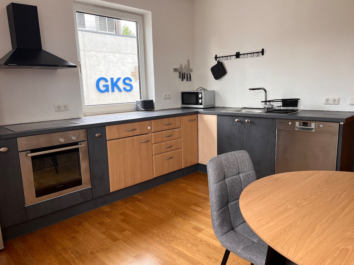 Oublie tes soucis – dans ce logement spacieux et calme d'environ 70 m². Un petit couloir, qui peut être utilisé comme vestiaire, mène à une cuisine entièrement équipée. Il y a une chambre avec un lit double 2,00 m x 2,00 m et une télévision et une autre chambre avec un lit confort 1,40 m x 2,00 m. Une salle de bain avec chauffage par le sol, douche à effet pluie, lavabo et toilettes. Le salon et la salle à manger ouverts et baignés de lumière peuvent également être utilisés comme poste de travail.
