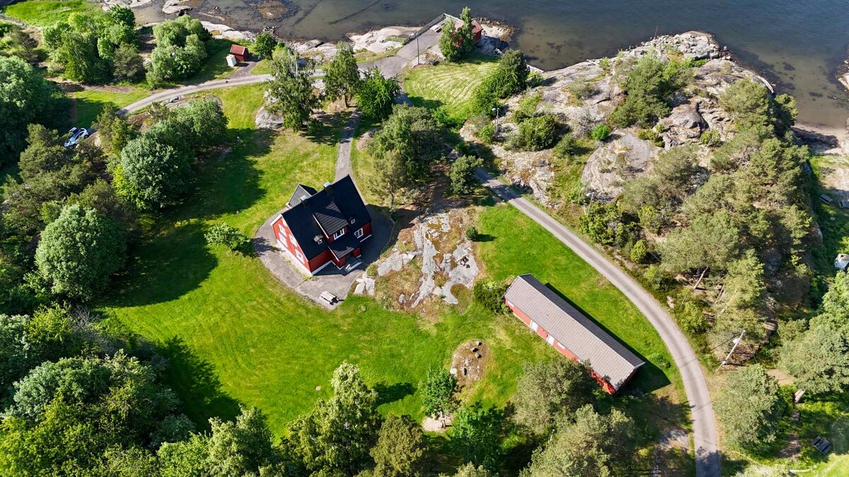 Maison d'été avec vue sur la mer et 40 mètres de côte, plage, jetée et propriété avec collines, forêt, groupes de détente en plein air et points de vue. Porche avec lampe chauffante. La maison d'été est située sur l'île sans voiture de Veierland, une île exclusive et un joyau caché dans le fjord d'Oslo, face à l'île d'enfance de Roald Dahl de Tjomoe (Tjøme). Il y a un bateau de 15 pieds avec 40 chevaux inclus que vous pouvez utiliser vers et depuis le continent. Il y a aussi un grand ferry qui part toutes les heures du continent.