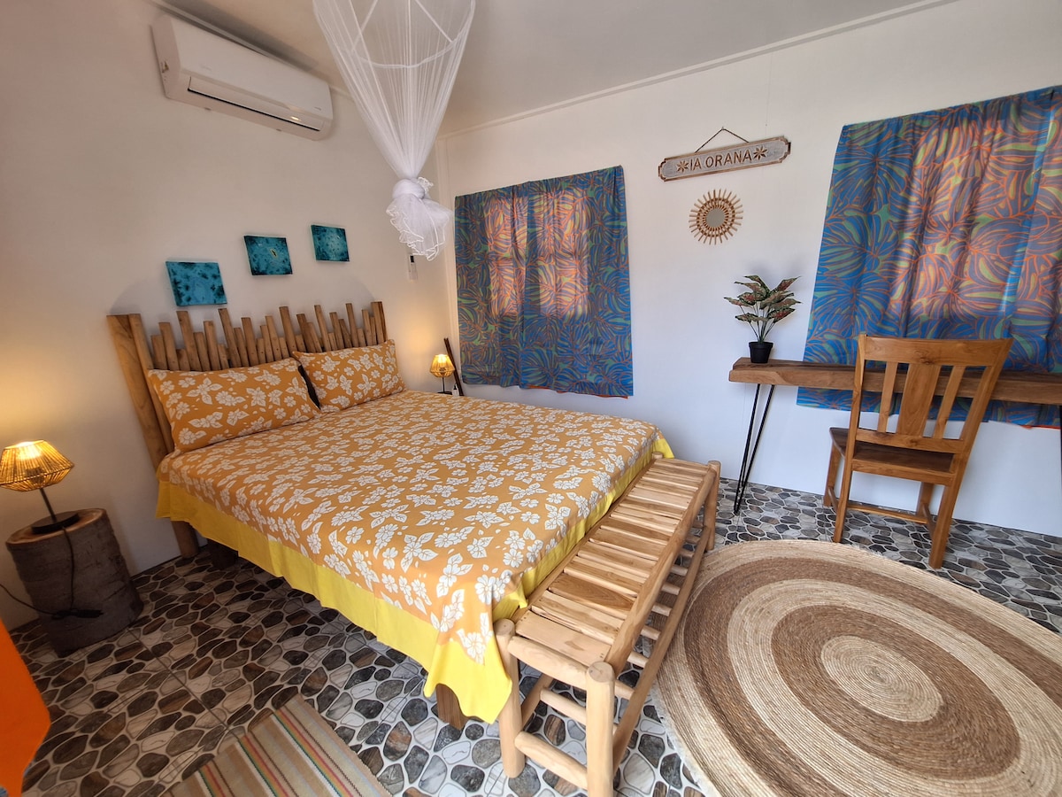 Bienvenue au Fare ‘Una’Una - Fakarava Niché au cœur d’un jardin tropical et à quelques pas d’une plage, le Fare ‘Una’Una est l’endroit idéal pour un séjour en toute sérénité à Fakarava. Ce bungalow confortable, conçu pour deux personnes. Pour explorer l’île à votre rythme, des vélos, scooters et voitures sont disponibles à la location, et un kayak est mis gratuitement à disposition. Aucun service de repas n’est proposé, mais des options de restauration sont accessibles à proximité.