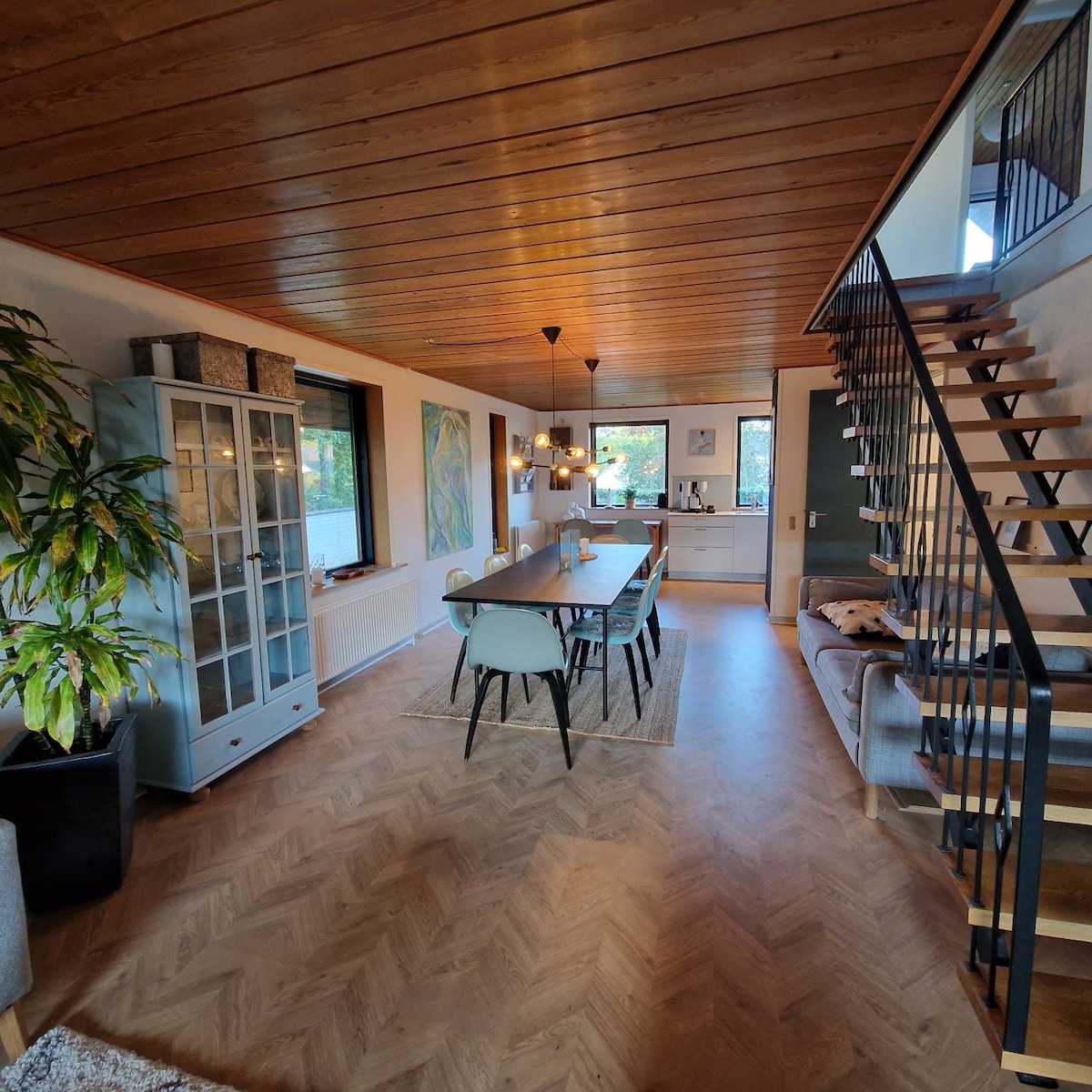Profitez du confort et de la tranquillité dans un appartement lumineux et agréable d'environ 50 m2 sous le plafond d'une grange aménagée. 1 sur un total de 2 appartements. Construit en 2021. 2 chambres, salon avec canapé-lit, cuisine complète et salle de bain privée. Accès à la piscine partagée. Idyllique à la campagne, mais à seulement 2,5 km de bons magasins, ainsi qu'à environ 10 minutes en voiture d'une fantastique plage de sable adaptée aux enfants. Chiens, chats et chevaux. Le propriétaire vit sur le terrain, mais pour la deuxième longue. Forfait Fibernet et TV. NOUVEAU 2025 : Salle de jeux avec baby-foot, tennis de table et console de jeux rétro.