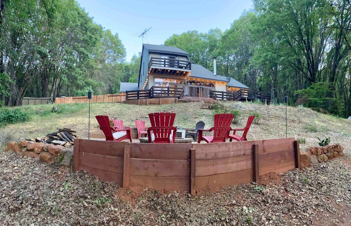 5 miles de l'autoroute 80, 10 miles de Grass Valley. 96 à 535 mbps. Chargeur EV-2. 20 $ par chien et par jour. 20 $ pour l'utilisation du jacuzzi, par séjour. Embarcadère à 1 mile. Votre côté privé de la cabane a une entrée privée dans vos 3 pièces : LR/salle à manger, cheminée, 2 br et 1 1/2 salle de bain. Pas de cuisine, mais il y avait un petit micro-ondes frigo, une cafetière, un barbecue, une cuisinière extérieure. BR 1 lit Q, BR2 2 lits jumeaux. LR dispose d'un canapé-lit TV + Q, de fauteuils et d'une cheminée. Utilisation du porche, de la terrasse arrière, du brasero. Très grande aire de stationnement. Entièrement clôturée.