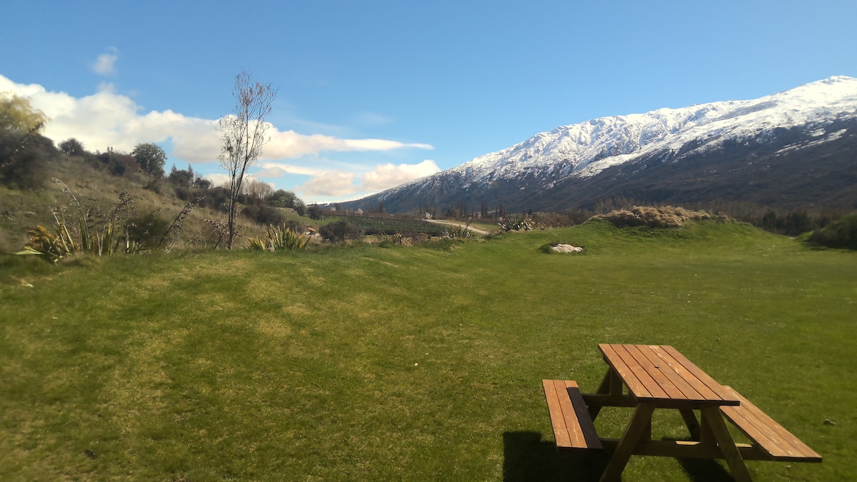 Chalet historique original en pierre de Goldminers situé sur la rivière Gibbston, piste cyclable et pédestre avec accès facile aux vignobles locaux. Présenté dans la dernière édition du guide NZ Lonely Planet - Ce chalet original de Goldminers magnifiquement restauré et primé date de 1874. Situé au cœur de la vallée de Gibbston avec une vue à 360 degrés sur Nevis Bluff, Mt Rosa et Waitiri Station, le chalet offre une base paisible et relaxante pour explorer les environs. L'intérieur du chalet est un studio ouvert avec un coin salon confortable à une extrémité et un coin chambre partiellement masqué à l'autre extrémité, avec une salle de bains séparée adjacente. La salle de bains est spacieuse avec douche et baignoire séparées. La chambre dispose d'un lit Queen Size et vous accédez au salon, à la salle à manger et à la kitchenette. La cuisine comprend une cuisinière et un four combiné micro-ondes. Réfrigérateur, bouilloire et grille-pain. Le chalet est idéal pour 2 personnes, mais il peut accueillir 2 personnes supplémentaires sur le canapé-lit dans le coin salon, car il se transforme en lit double et le linge de lit complet est fourni. Blottissez-vous devant le feu chaud et confortable, détendez-vous et ressourcez-vous. À distance de marche de 3 vignobles locaux et de sentiers de randonnée menant à Nevis Bluff, Mt Rosa et Coal Pit Road. Situé directement sur le nouveau sentier de la rivière Gibbston, vous pouvez vous rendre à vélo à la taverne Gibbston, au vignoble Peregrine, au vignoble Gibbston Valley et au pont AJ Hacket Bungy. Continuez ensuite directement sur les sentiers de Queenstown jusqu'à Arrowtown et Queenstown depuis la porte. Accès facile à la gare de Gibbston Valley et aux nouvelles pistes cyclables de Rabbit Ridge récemment ouvertes. Gibbston est à 10 minutes en voiture d'Arrowtown et à 20 minutes de l'aéroport de Queenstown. Cromwell et Bannockburn sont à 20 minutes en voiture. Wanaka est à 40 minutes soit via le Crown Range, soit en passant par Cromwell. Le chalet est facile d'accès à toutes les activités de Queenstown et de ses environs et très pratique pour les nombreux domaines skiables de Queenstown et de Wanaka en hiver. Situé dans son propre jardin sur notre propriété de 6 acres où nous avons construit une maison en paille, vous êtes invités à rendre visite aux chevaux, à ramasser les œufs de nos poules et à caresser nos moutons. Servez-vous de nos produits de saison du jardin. Des vélos sont disponibles pour explorer les sentiers. Le bois de chauffage est fourni. Des meubles d'extérieur et un barbecue sont fournis pour la vie en plein air. *Linge de maison fourni et inclus avec la location. * Les visiteurs doivent nettoyer et laisser la propriété telle qu'elle a été trouvée.